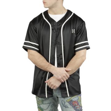 Baseball fan? or simply a fan of jersey style shirts this is a must have for this Spring! HUF has brought out their own twist to this baseball jersey. Slick and lightweight this jersery is made with 100% polyester satin material. It features colorful embroidered hand and floral images on the back and white pin stripes on the sleeves. Full button-up with 6 buttons on the front.
