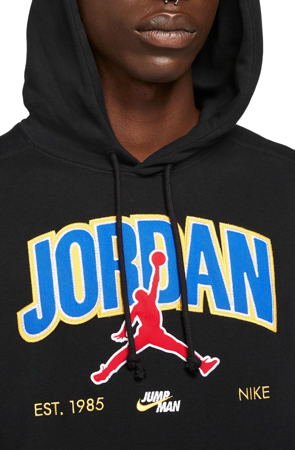 Find easy comfort in the Jordan Jumpman Pullover Hoodie. It's made from heavyweight French terry with a right weight and warmth for the season. Premium patches and embroidery detail raise the look and feel of the artwork.