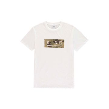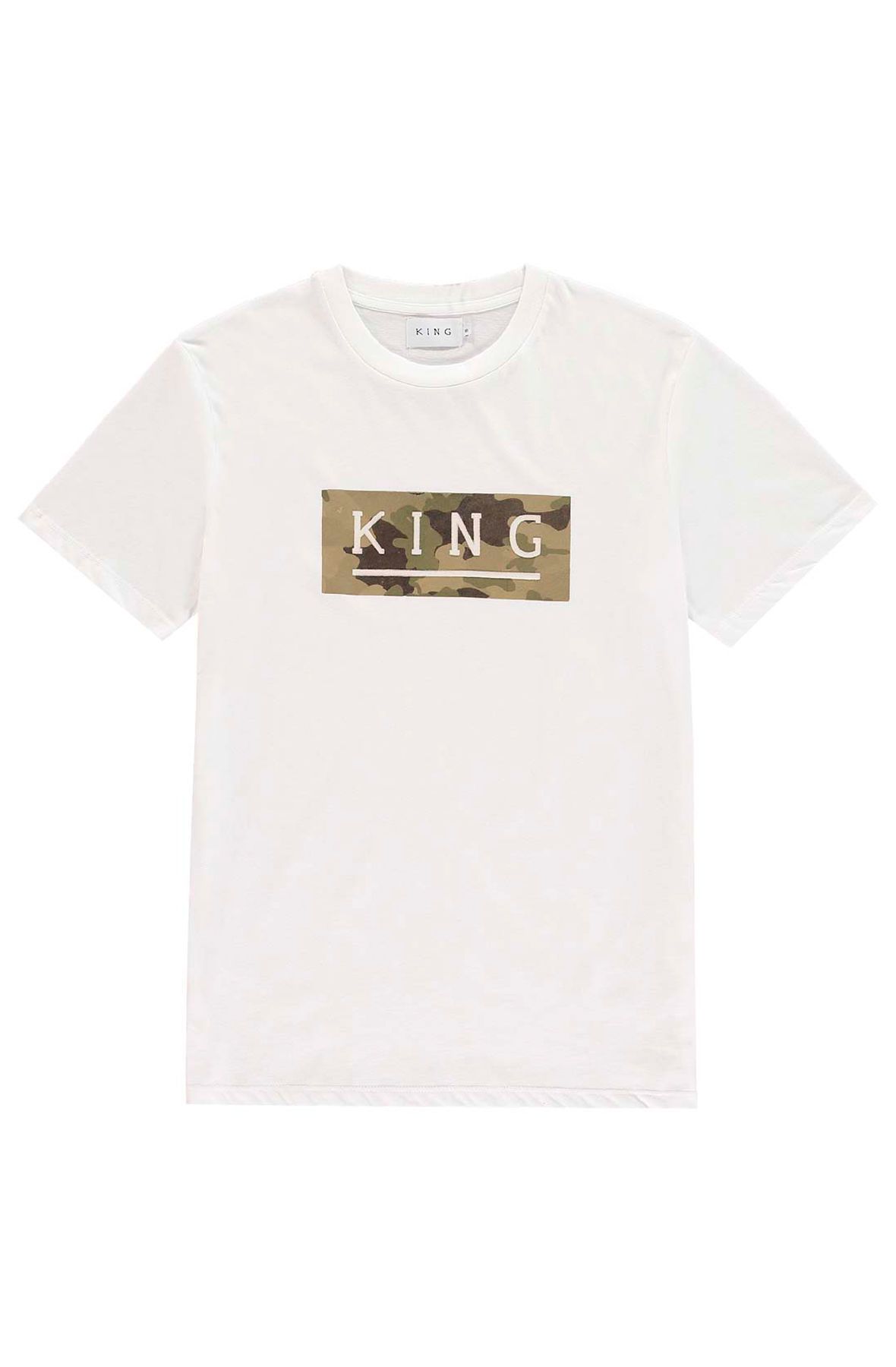 -Camo box design with KING in white felt flocking on chest