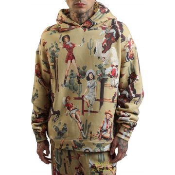 Embrace your inner cowboy with the Tan Men's Jesse All Over Pattern Hoodie, featuring a unique cowboy-inspired print that brings western flair to your urban wardrobe. The iconic Lifted Anchors logo, embroidered on the left chest, adds a touch of rodeo charm to this loose-fitting hoodie, perfect for any casual outing.