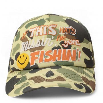 Market brand features their iconi trucker style hats with the men's Smiley Camo Trucker Hat. Featuring fun and cool logos screen-printed front and centered.