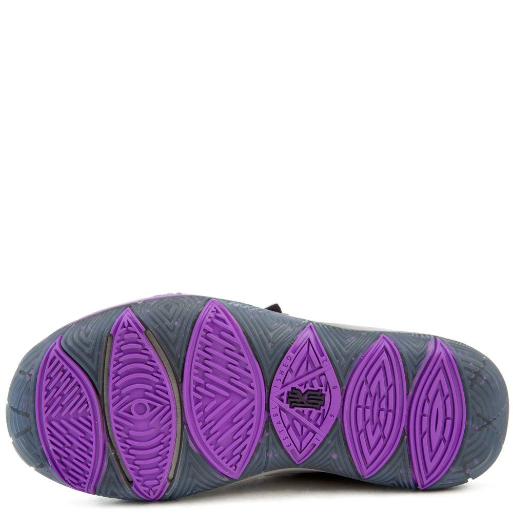 The (PS) Kyrie 5 feature a grey upper, hints of purple, a durable rubber outsole, and Zoom cushioning for added support.