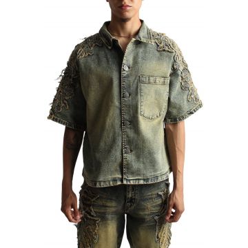 Elevate your streetwear game with the Tribal Patch Denim Shirt by Rebel Minds! This cropped, short-sleeved button-up features a light wash with a distressed, deconstructed look that screams urban cool.