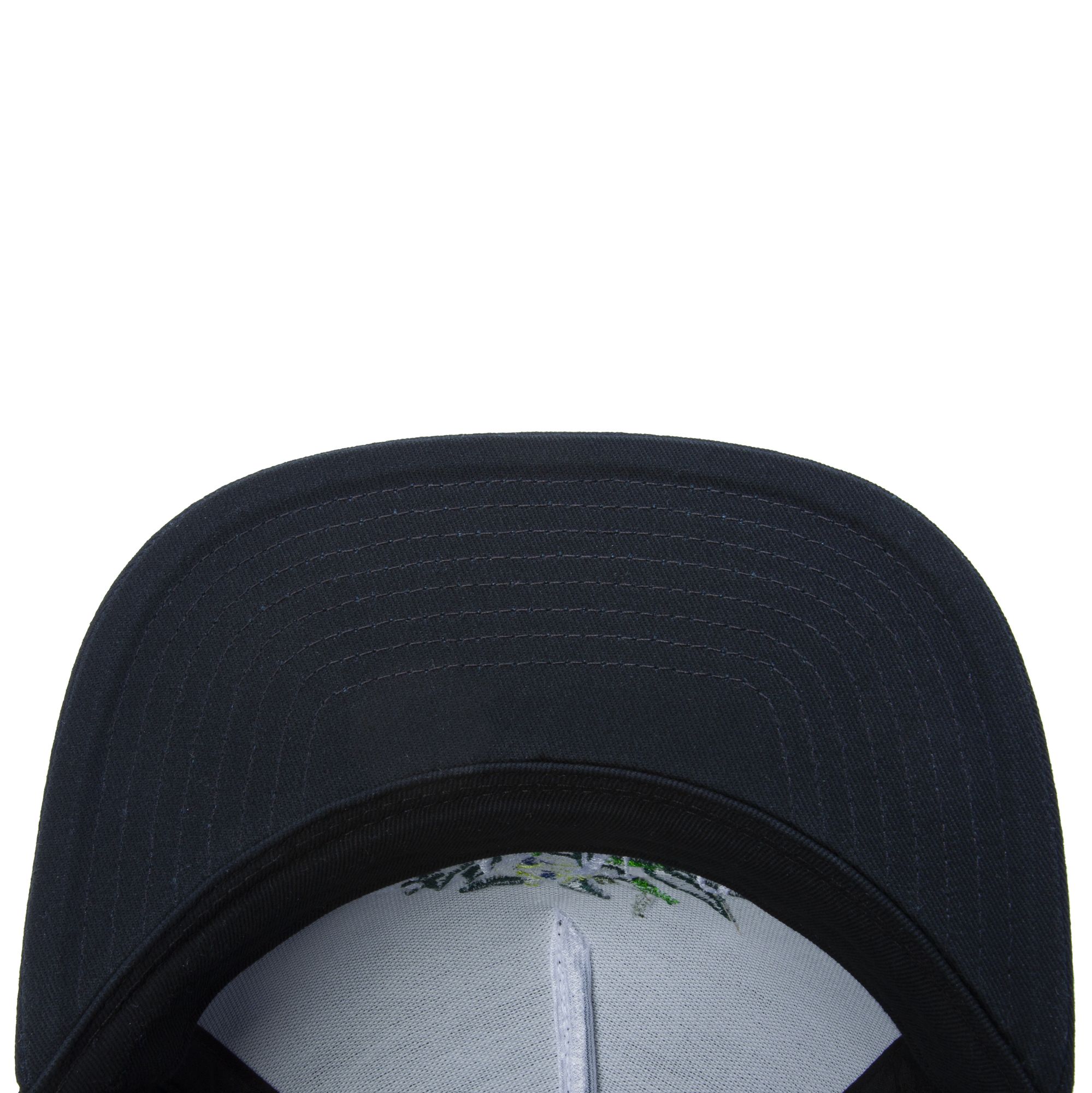 The Greenhouse Snapback is a 100% cotton 5-panel snapback hat with embroidered art at the front featuring a skull entwined in leaves.